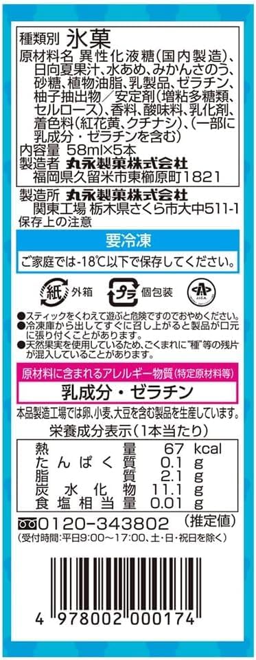 商品の説明 つぶつぶみかん入りのフルーツアイスバーお花のようなアイスバー可愛らしいお花の形をしたシャキシャキ食感のアイスキャンディーフルーツアイス宮崎県産日向夏果汁を使用したアイスにつぶつぶみかんを混ぜたアイスバージューシーな果汁感と苦みを感じるアイスジューシーな果汁感とほのかな苦みが楽しめるサク咲く食感のアイスをお楽しみください 原材料・成分 異性化液糖(国内製造)、日向夏果汁、水あめ、みかんさのう、砂糖、植物油脂、乳製品、ゼラチン、柚子抽出物/安定剤(増粘多糖類、セルロース)、香料、酸味料、乳化剤、着色料(紅花黄、クチナシ)、(一部に乳成分・ゼラチンを含む)
