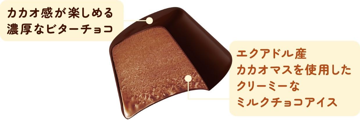 商品の説明 クリーミーなミルクチョコアイスを、濃厚なビターチョコでコーティングした、ひとくちアイス。 エクアドル産カカオマスを使用したミルクチョコアイスと、カカオ風味豊かなビターチョコのコーティングでチョコずくしの味わいです。 原材料・成分 乳製品(国内製造、オーストラリア製造)、チョコレートコーチング、砂糖、植物油脂、水あめ、ココア、カカオマス/乳化剤、安定剤(増粘多糖類)、香料、(一部に乳成分・大豆を含む)