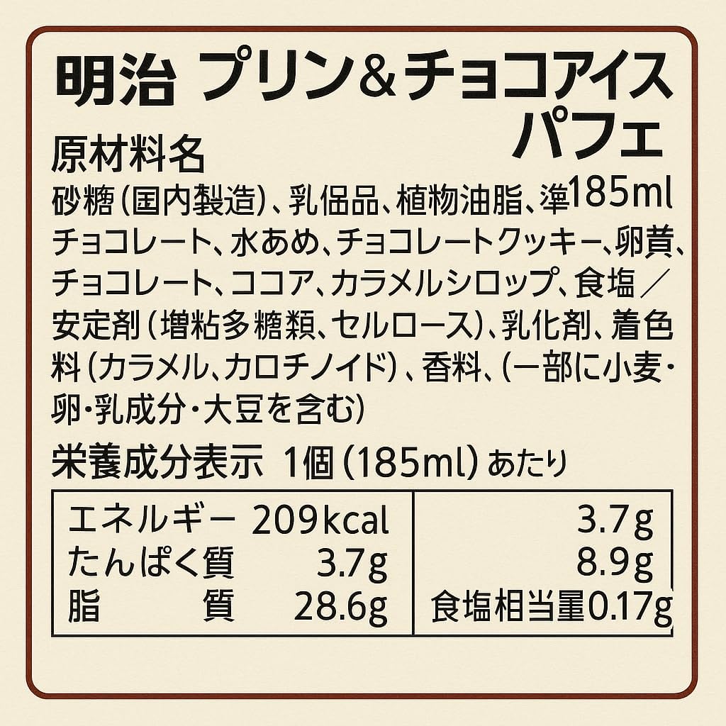商品の説明 上層はプリンアイスにカラメルソースとクッキー、下層は明治のチョコレート原料を練り込んだチョコアイスで、濃厚なカカオの味わいをお楽しみいただけます。 原材料・成分 砂糖(国内製造)、乳製品、植物油脂、準チョコレート、水あめ、チョコレートクッキー、卵黄、チョコレート、ココア、カラメルシロップ、食塩/安定剤(増粘多糖類、セルロース)、乳化剤、着色料(カラメル、カロチノイド)、香料、(一部に小麦・卵・乳成分・大豆を含む)