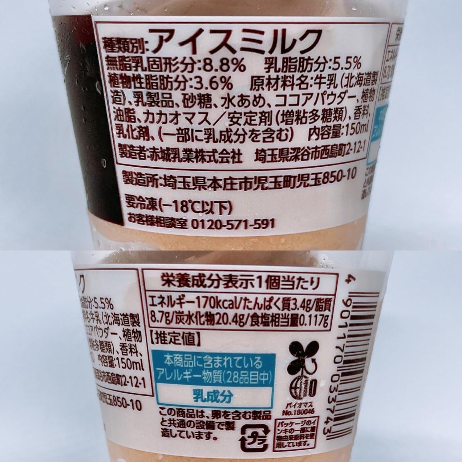 原材料・成分 牛乳(北海道製造)、乳製品、砂糖、水あめ、ココアパウダー、植物油脂、カカオマス/安定剤(増粘多糖類)、香料、乳化剤、(一部に乳成分を含む)