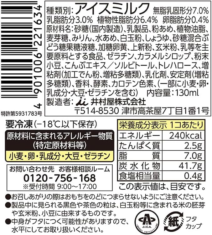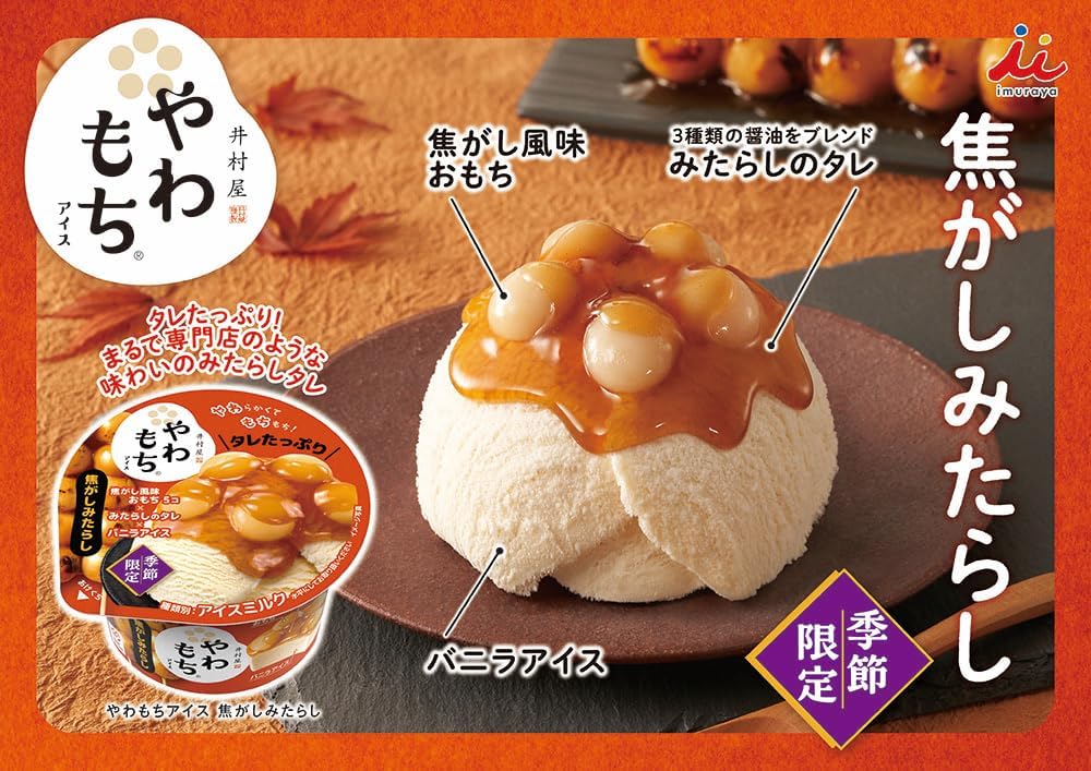 商品の説明 コク、香り、旨みに優れた3種類の醤油をブレンドし、さらに昆布エキスを入れることで、甘味処で食べるみたらし団子のような旨みのある味わいにしました。ソースをアイスの上だけでなく、おもちの上からもかけることで、みたらし団子のような見た目もお楽しみいただけます。 冷凍下でもやわらかいおもちは白玉粉と上新粉をブレンドして作ることで、団子らしい歯切れの良い食感が楽しめます。また、柿の種を粉砕したパウダーを配合することで焼いたおもちのような香ばしさを表現しました。 バニラアイスは北海道産の生クリームをベースに、みたらしソースとの相性が良くなるよう仕上げました。また、少量の焙煎した小豆パウダーを入れることで、ほのかな香ばしさをプラスしています。