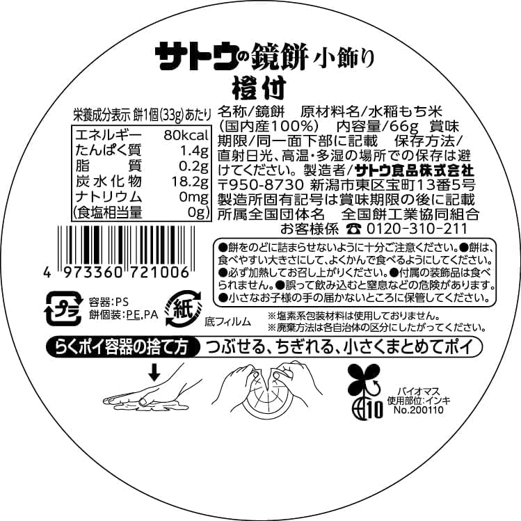 商品の説明 伝統的な橙飾りのついたそのまま飾れるタイプ。らくポイ容器採用。 上部の橙は紙製です。 原材料・成分 餅